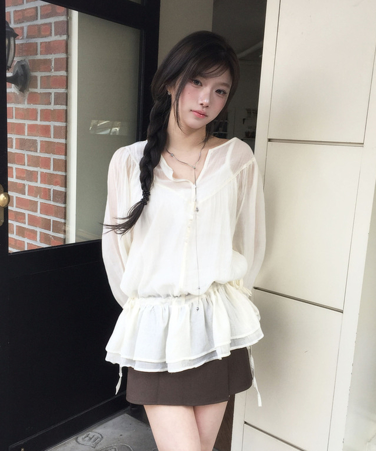 Vネックフリルシャーリングブラウス