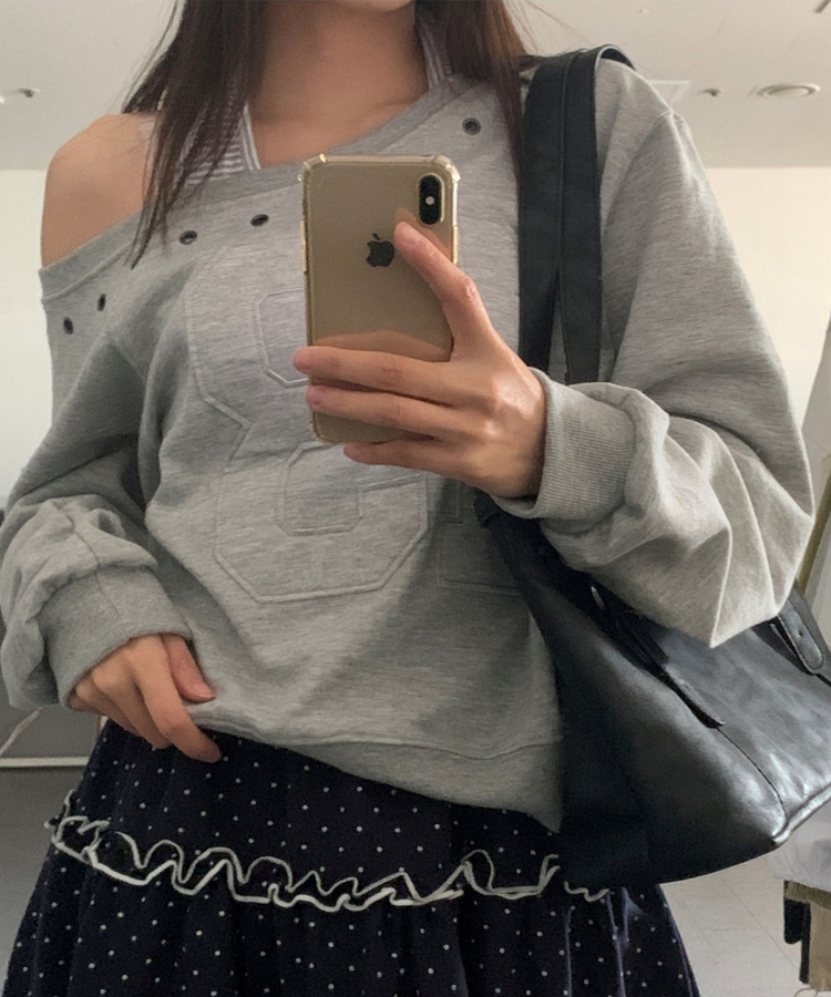 オフショルダーボタンシアリング長袖Tシャツ