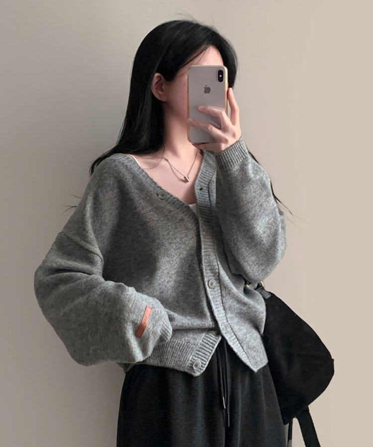 Vネックレザーラベルカーディガン(5color)