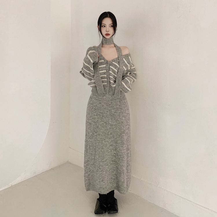 【SET マフラー付き】ストライプニットカーディガン ニットロングスカート