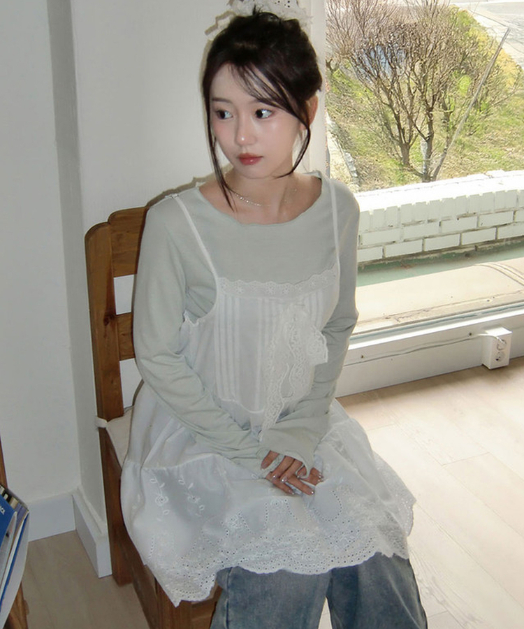 レースリボンパンチングミディワンピース